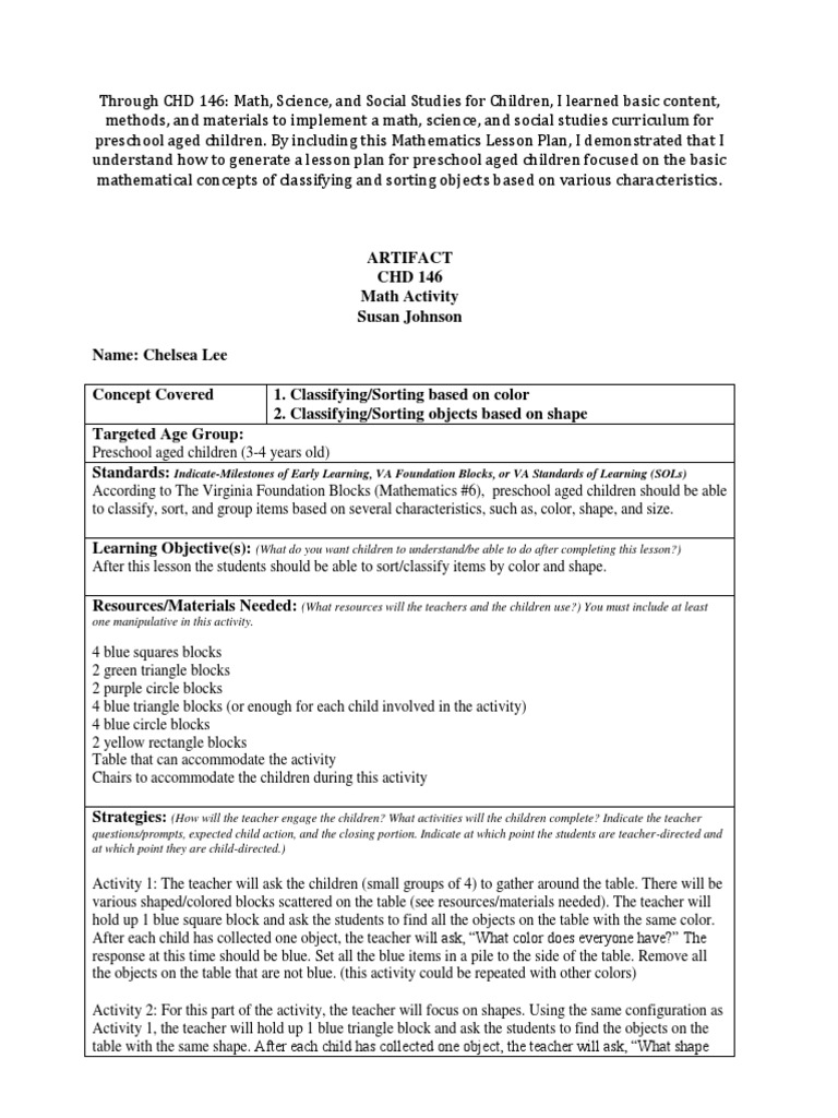 Chelsea Math Lesson Plan Artifact Shape Preschool